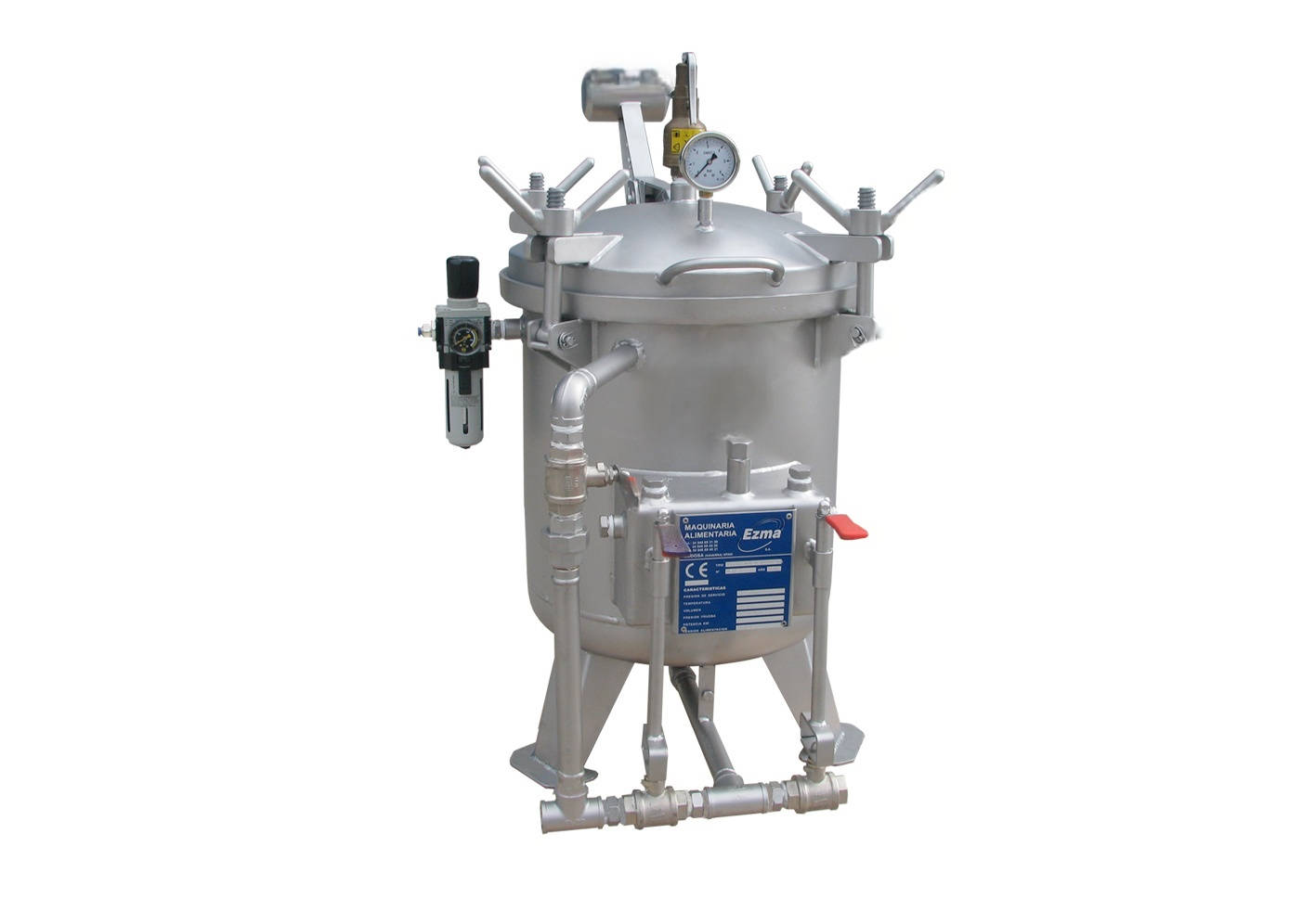 Автоклавы для промышленной стерилизации герметично упакованных продуктов питания. Быстрое закрытие крышки и подъем крышки пневматическим цилиндром. Автоклав дополнен предохранительными клапанами, измерителем давления, термометром и т. д. Автоклав комплектуется микропроцессором для контроля температуры и давления, с возможностью запоминания программ и возможностью. Возможность стерилизации по Fo. Регистрация по датчику. Регистрация графика на бумаге. Дополнено 3-мя пневматическими модульными клапанами для воды, воздуха, пара и избыточного давления.