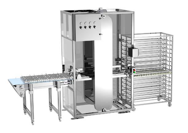 Загрузчик/разгрузчик лотков с тележек предназначен для автоматического переноса лотков с тележки на конвейер. Встроенный конвейер может быть присоединен к любой из машин. Современное программное обеспечение позволяет быстро осуществлять смену лотков.