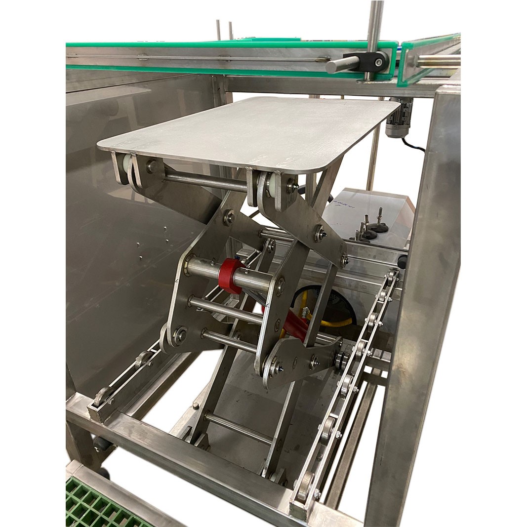 Банки накапливаются на вращающемся столе загрузчика корзин. Оператор вручную проталкивает банки, формируя ряд (слой) банок в корзине. После формирования ряда банок в корзине оператор при помощи джойстика управляет опусканием подвижного дна на дискретную величину, укладывает пластиковую прокладку и продолжает формирование следующего ряда.